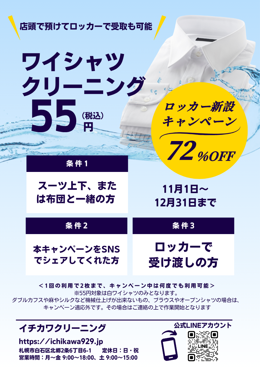 【期間限定】ワイシャツクリーニングが55円!ロッカー新設キャンペーン開催