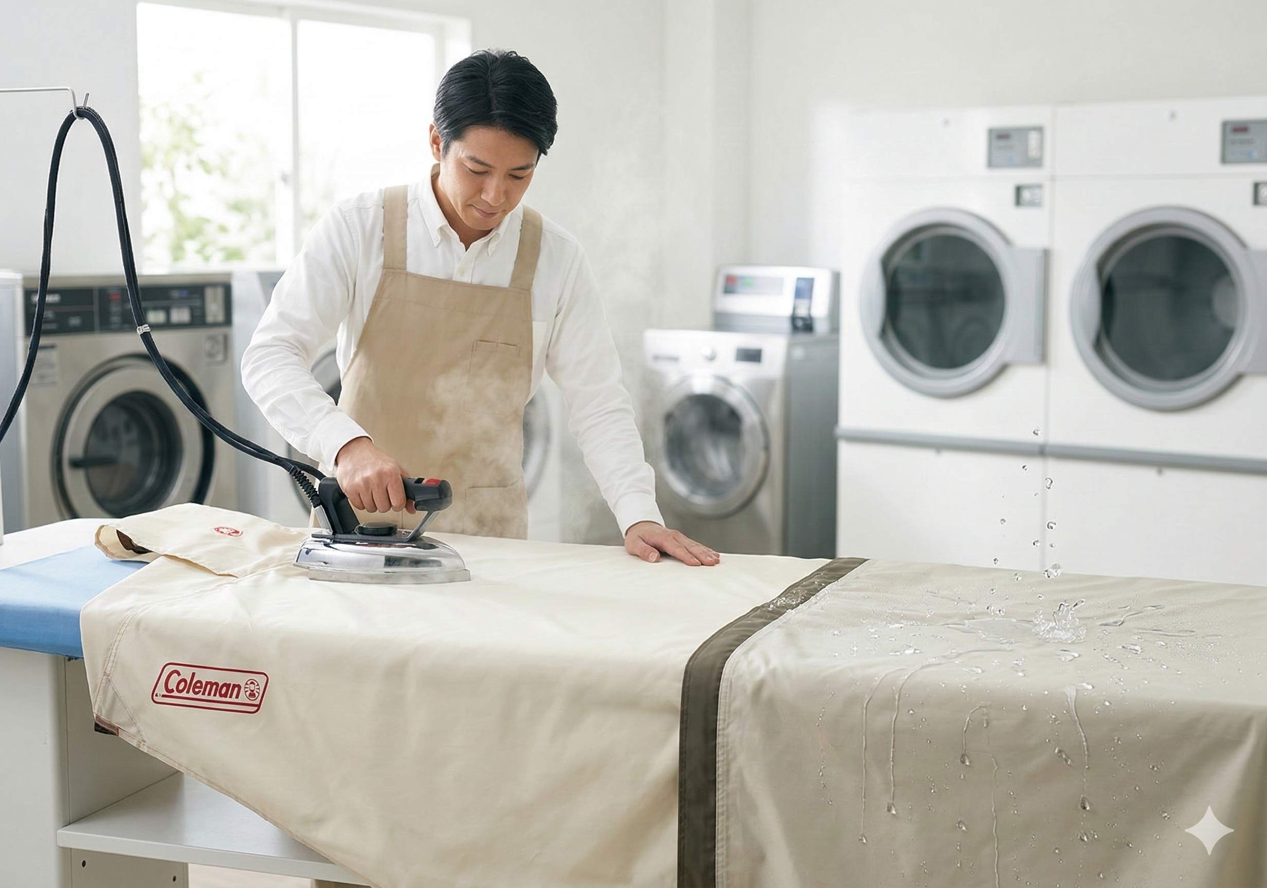 「えっ、テントにアイロン?」と思われた方も多いかもしれません。しかし、これこそが、当店の撥水加工を「強力」かつ「長持ち」させるための、極めて重要な工程なのです。